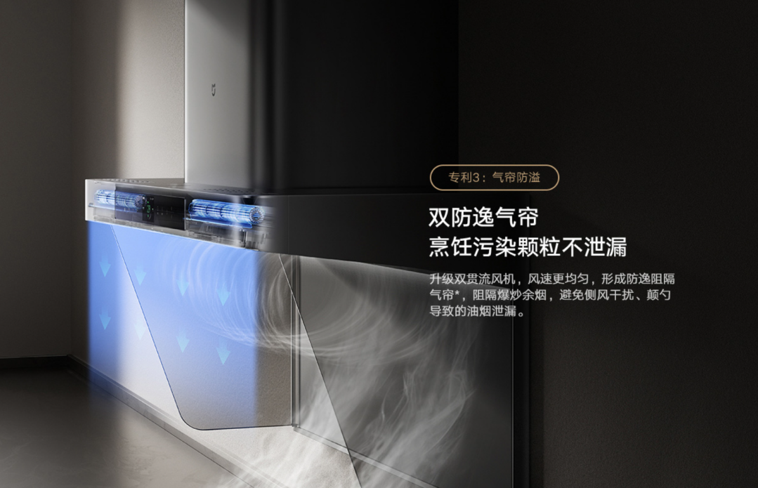 最后是防逸阻隔气帘技术,双气帘组件在烟机前侧形成 “空气墙”,即使在人员走动、颠锅等动态场景下,也能有效阻断油烟扩散,把试图逃逸的油烟吹回捕集区。这一设计,完美解决了传统烟机的油烟逃逸问题。