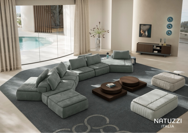 Andrea Steidl从对建筑与新生活方式的思考出发,将扶手或靠背转化为功能元素——可以是台面、书架、边桌,甚至储物单元。Amama作为一个模块化的“岛屿”系统,以其独特的双面可坐布局,彻底改变了传统的客厅社交模式。多种不同模块提供了无限的组合自由,使其能够灵活适配任何空间,无论是住宅还是商业场所。Natuzzi风格中心精心挑选的Salina皮革、Marechiaro织物与烟熏橡木、青绿漆木等材质,在对比与融合中延续了项目整体的和谐对话。