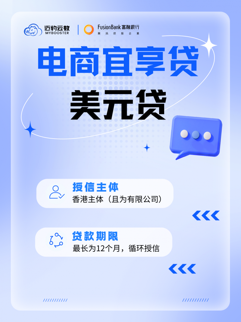 在跨境贸易持续蓬勃发展的背景下,跨境电商融资市场呈现出不可忽视的涨势,为突破传统信贷模式效率瓶颈,近期,迈豹云数(深圳)科技有限公司(MyBooster,下称迈豹云数)与腾讯控股有限公司控股企业富融银行有限公司(Fusion Bank,下称富融银行)正式达成合作协议,跨境电商美元融资产品——电商宜享贷正式上线,为香港注册的企业提供快速、灵活的美元融资解决方案。