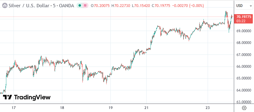 与此同时,现货白银价格日内一度涨近2.3%报每盎司70.67美元,历史性地升破了70美元关口。值得一提的是,前一次“历史性地”升破60美元关口还是在本月上旬,年初至今银价累涨超140%。