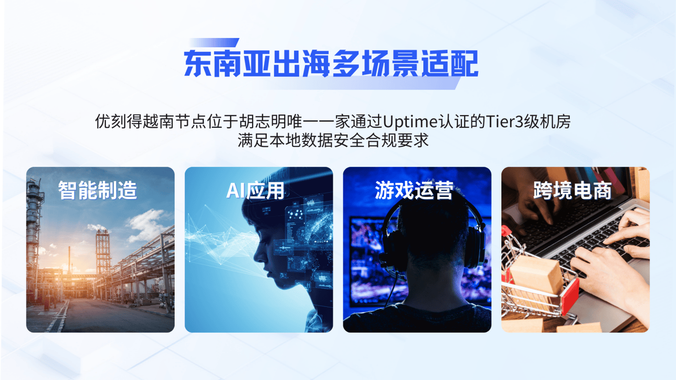在全球AI产业加速演进的背景下,东南亚正成为最具活力与增长潜力的核心区域之一。优刻得通过持续完善越南节点智算资源与服务能力,进一步强化面向东南亚市场的本地化交付与长期运营支撑,助力客户把握时代增长机遇。