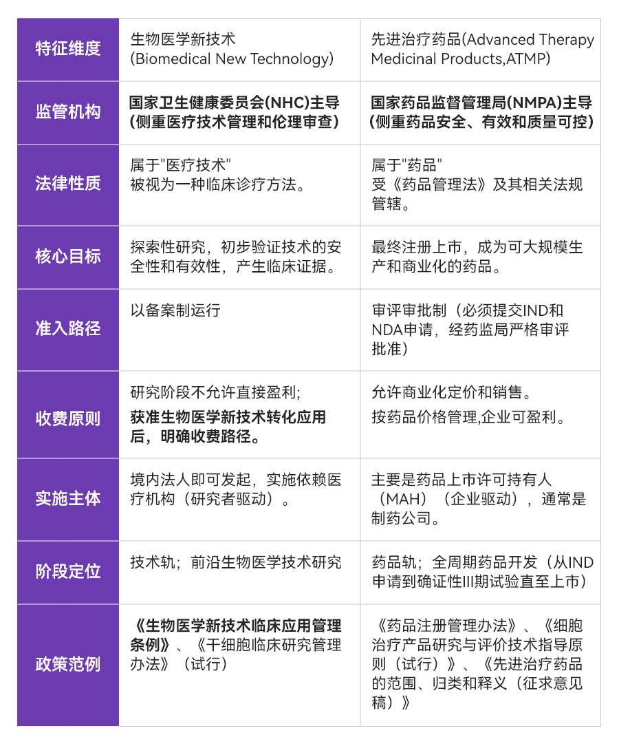 生物医学新技术和先进治疗药品是中国监管体系下针对CGT等前沿领域两个既紧密关联又存在本质区别的术语,同时也是双轨制管理下相互衔接但又有所区分的发展路径(技术轨&药品轨) 。