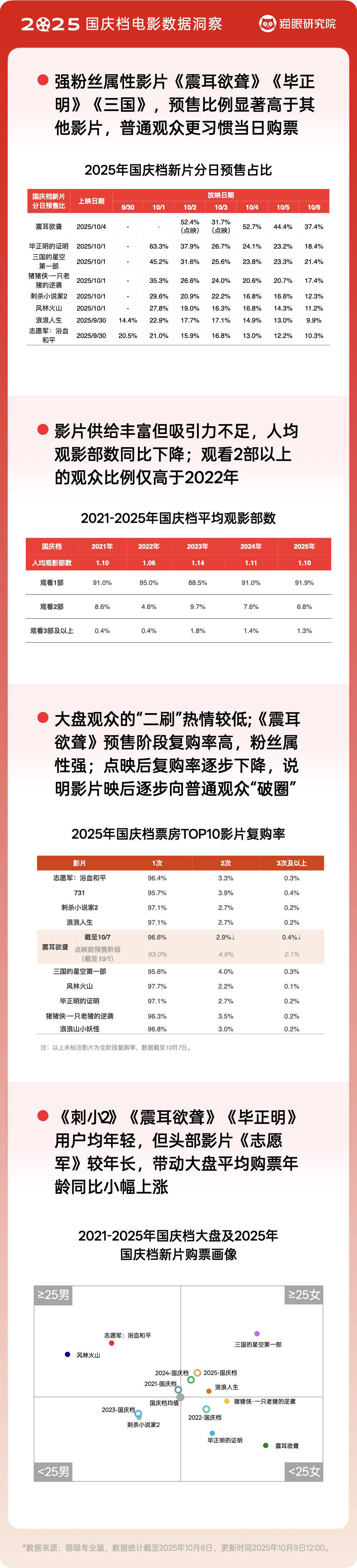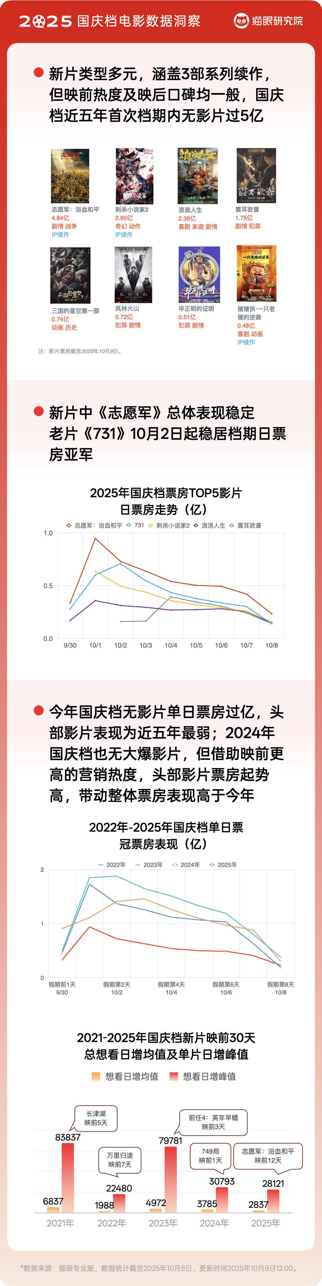 整体上看,尽管今年国庆档表现稍显乏力,新片映前热度及映后口碑均一般,但市场在影片供给、票价策略和分众满足方面仍体现出一定的适应性与多样性,也侧面反映了观众对于高质量“爆款”作品的迫切需求。