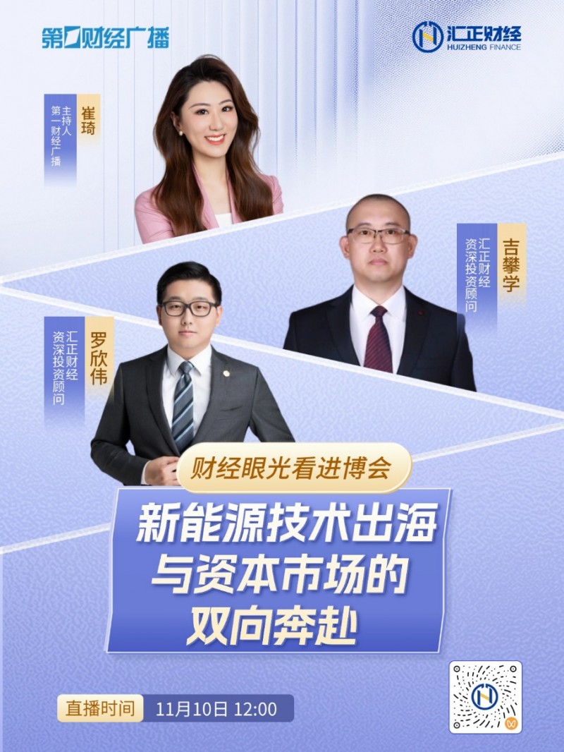 下一期内容《新能源技术出海与资本市场的双向奔赴》,请关注11月10日中午12:00特别直播,可通过海报识别二维码进行预约,或关注汇正财经官方视频号进行直播预约,敬请关注!