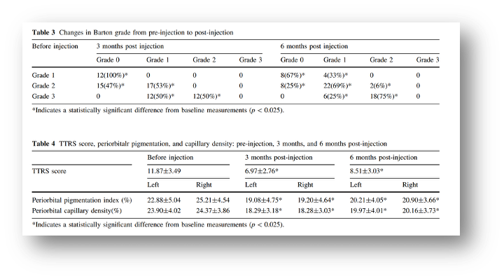 1. 客观指标显著改善:?治疗后3个月,色素指数平均下降超15%,毛细血管密度降低约23%,泪沟严重程度评分(TTRS)改善达41%。所有指标在6个月后仍显著优于治疗前水平。