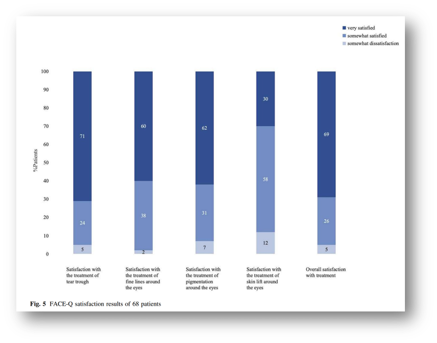 2. 患者满意度极高:?基于FACE-Q量表的调研显示,患者对泪沟改善的满意度高达71%,整体治疗满意度达69%。