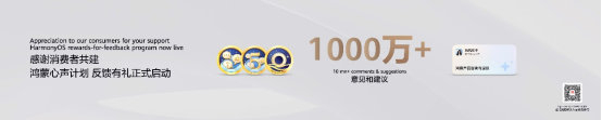 行百里者半九十,鸿蒙仍在发展的路上,鸿蒙高度重视用户体验与反馈。目前已累计收到超过1000万条用户建议, 96%以上实现快速闭环,鸿蒙正在变得越来越好。伴随“鸿蒙心声计划——反馈有礼活动”上线,所有使用搭载HarmonyOS 5设备的消费者,每反馈一个问题或需求,不仅可以获得定制勋章,还有机会可以获得鸿蒙手机、平板等奖品。