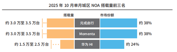 元戎启行凭借“技术+量产效率”的综合优势,在新订单争夺战中抢占先机,2025年1-10月,其城区NOA累计搭载量约12万至15万台,市场份额稳居行业前三,而10月单月市占率飙升近四成,实现跨越式增长。截至2025年底,搭载元戎启行辅助驾驶系统的量产车辆交付超20万台,覆盖车型超15款,规模化的交付能力与稳定的产品表现,赢得了主机厂的广泛认可,为新订单拓展奠定了坚实基础。