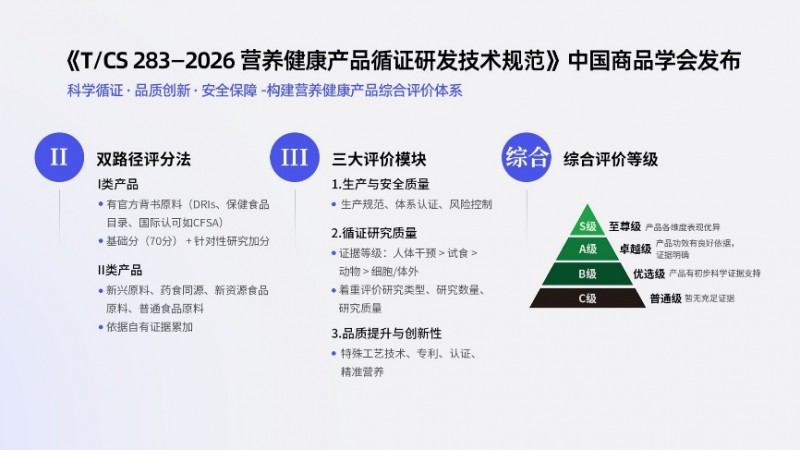 作为行业首个系统规范营养健康产品循证研发全流程的团体标准,其创新构建两级分类路径,三大评价模块,S/A/B/C四级产品综合证据等级金字塔。该标准有效破解行业科学证据质量参差、评价标准不统一的痛点,将循证研发转化为可操作、可评估的统一行业评价体系,标志着营养健康食品行业循证标准化、规范化发展迈出实质性关键一步。