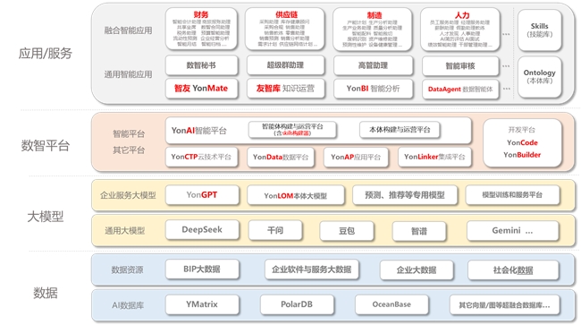 用友网络数据与智能BG总裁何强进行了用友BIP企业AI产品矩阵焕新重磅发布。该产品矩阵在数据层、模型层、数智平台层到智能应用与服务层全面升级并全链路贯通,包括已推出的本体构建与运营平台、本体大模型,重磅推出Skills构建器。