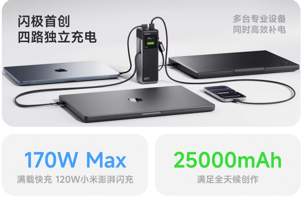 而据市场研究机构Canalys的报告,快速自充技术已成为移动电源市场的重要卖点之一。闪极170W超充站移动电源首创四口独立快充设计,采用四路独立充电架构和四核安全芯片,总功率输出高达170W。这意味着用户可以同时为四台设备充电,且每台设备都能获得稳定且高效的充电速度。随着现代年轻用户对多设备同时充电的需求日益增长,闪极的这一创新设计无疑击中了用户的痛点,节约了时间成本,大大提升了充电效率。