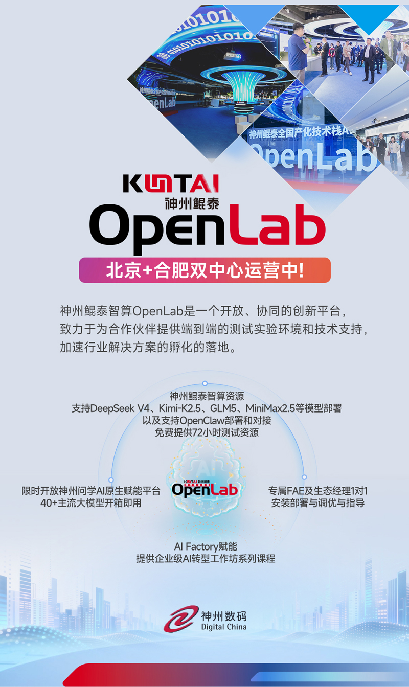 为进一步加速技术落地,KunTai OpenLab 北京、合肥双中心同步开放 DeepSeek V4 专属测试环境,提供真实场景下的性能验证、方案优化与适配指导,助力金融、能源、政务等行业客户快速完成场景化方案孵化,推动技术从测试环境走向产业实践。