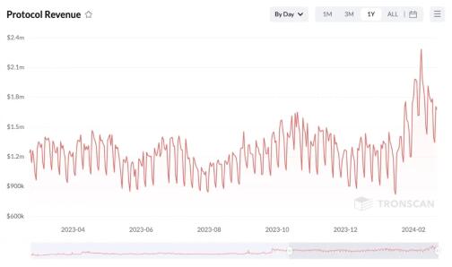 活跃的生态状况正在为 TRX 的质押者们带来丰厚收益,本月早些时候,波场 TRON 单日协议收入一度达到 16800159 枚 TRX,价值约 2286203 美元,创下历史新高。此外据 Tronscan 数据,波场 TRON 过去一年协议总收入已高达 4.58 亿美元。