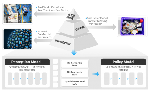 模型在投入真实仓库使用前,已经过严格的多层次测试,从互联网数据、仿真数据到真机数据逐级验证其可靠性与适应性;最终通过轻量化技术部署到各仓库工作站中,实现AI模型在复杂仓储环境中的快速应用与持续进化,形成“越用越智能”的良性循环,为仓储无人化提供高性能、可复用的抓取与决策能力。