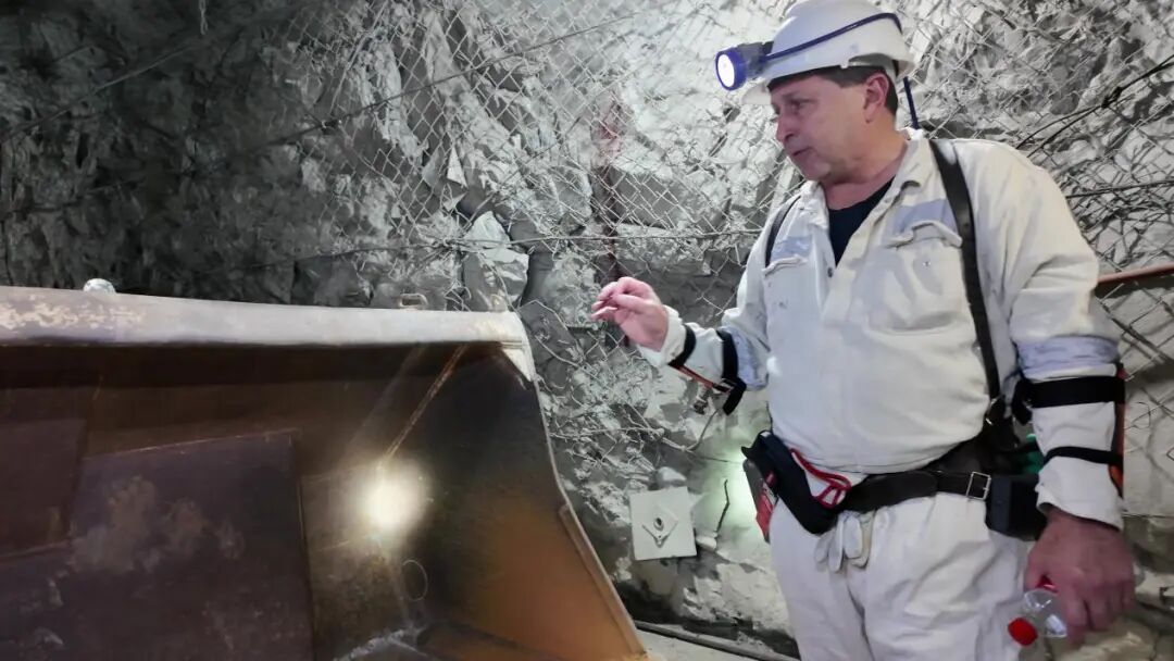 (沃伦·弗里玛在井下向记者讲述矿石运输流程)