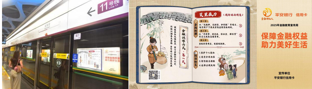 在福田、南山、罗湖、宝安、龙岗等核心商圈地铁站,平安银行信用卡中心以通俗易懂的语言和生动形象的插图,巧妙地将金融教育内容与传统文化相结合,创新推出“金融识诈六式”系列主题灯箱。灯箱设计聚焦高发诈骗场景和非法金融活动,以三步拆解套路,搭配“防诈秘笈”与二维码延展知识库,引发市民思考,强化反诈意识。市民王女士表示:“灯箱设计就像通关秘笈,等地铁时扫一眼就能记住关键点”。
