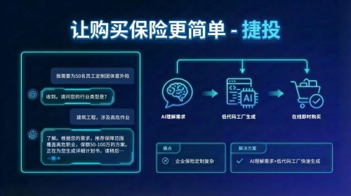 传统保险产品定制流程复杂、周期长,难以满足用户高度个性化的风险需求,为此保准牛通过融合生成式AI与低代码产品工厂能力,推出捷投·智能保险定制引擎。