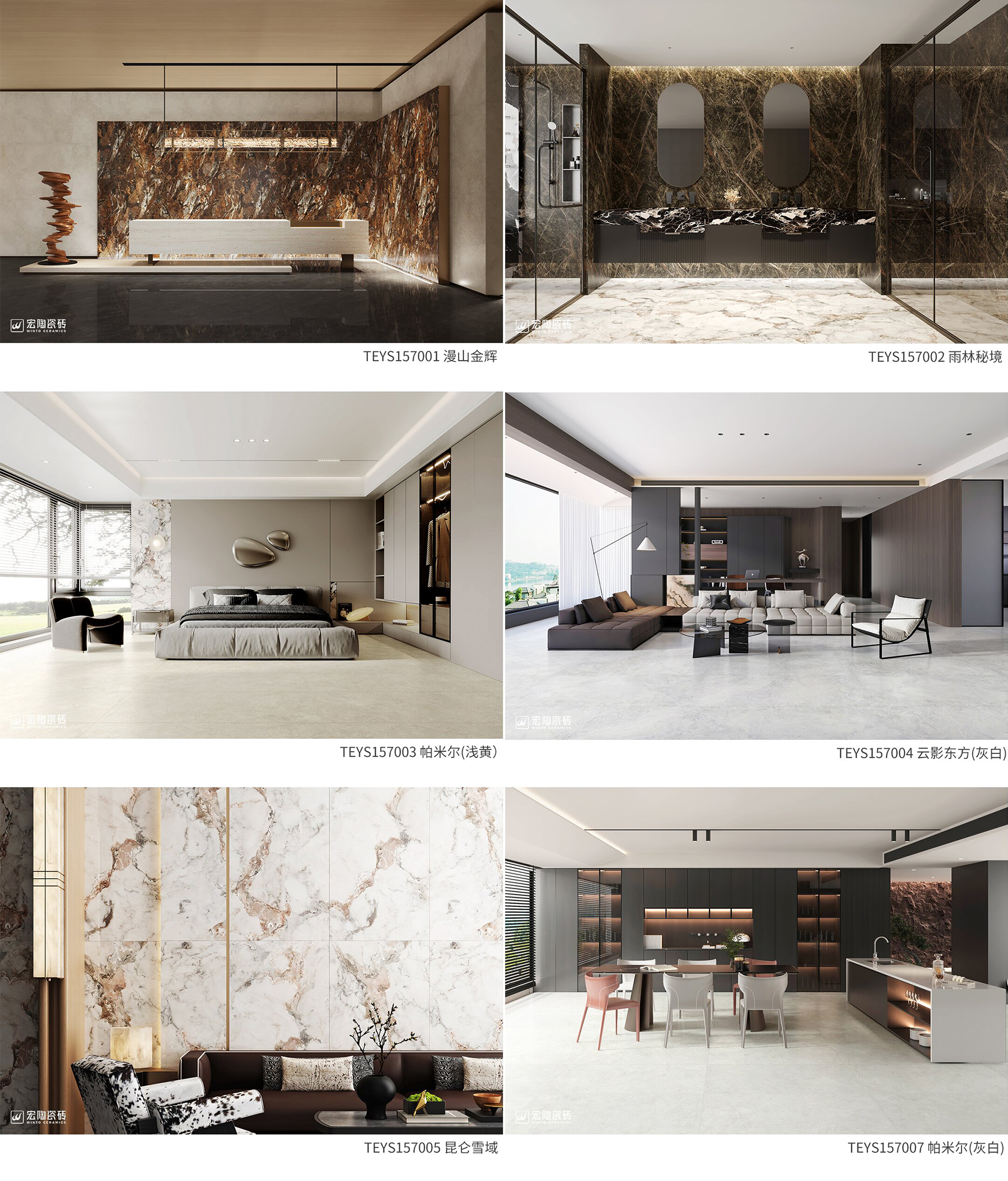 「昆仑山」系列创新采用数码模具与定位浮雕干粒工艺,通过微凸纹理的精准堆叠,呈现出层次丰富、逼真自然的石材质感。研发过程中,宏陶团队运用新一代浮雕技术叠加数码模具,重构了天然石材的肌理表达,显著增强立体感与层次感。此外,该系列不仅实现了视觉上的震撼效果,更具备超越天然石材的耐磨、防滑与抗污物理性能,真正达成艺术美感与实用价值的完美统一,铸就历久弥新的产品品质。