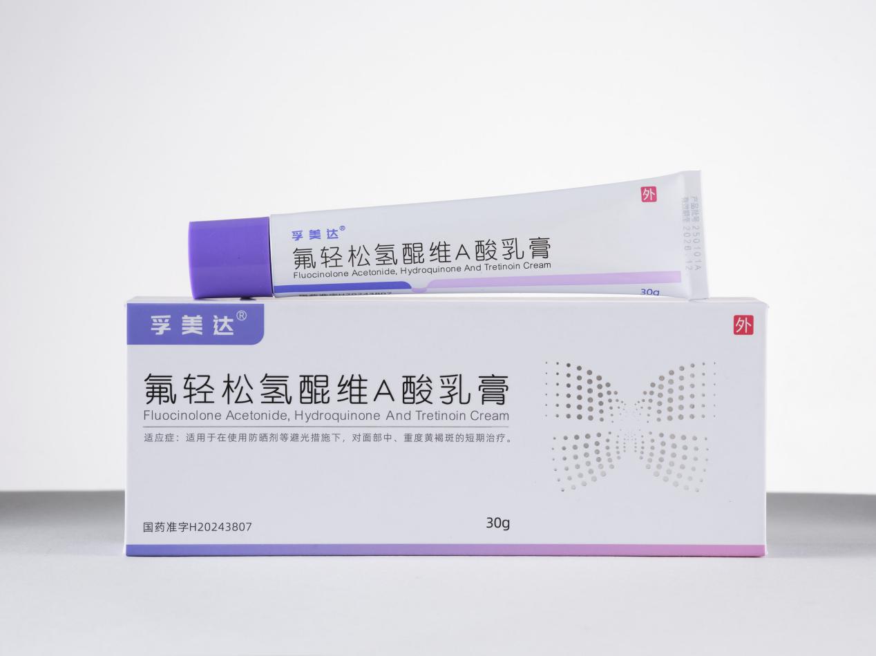 在巩固核心产品优势的同时,孚诺医药也在持续拓展其产品边界。除了孚诺?软膏这一明星产品外,企业还成功获批国内首个黄褐斑治疗复方外用制剂[2]——孚美达?氟轻松氢醌维A酸乳膏。该产品以“抑黑+促渗+抗炎”三重机制,成为国内首款黄褐斑一线治疗的金标准配方,实现了祛斑与抗敏感的双重功效。
