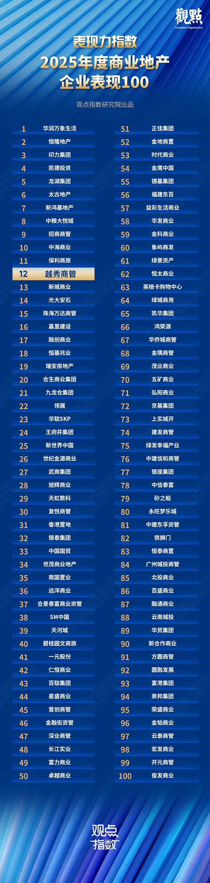 此次荣获2025年度商业地产企业表现TOP12,是行业对越秀商管在资产运营、品牌建设与创新实践等方面综合实力的高度认可。展望未来,越秀商管将继续践行“城市生活合伙人”的定位,通过运营与创新探索,拓宽商业空间的价值边界,共同激发区域活力,与城市共创美好未来。