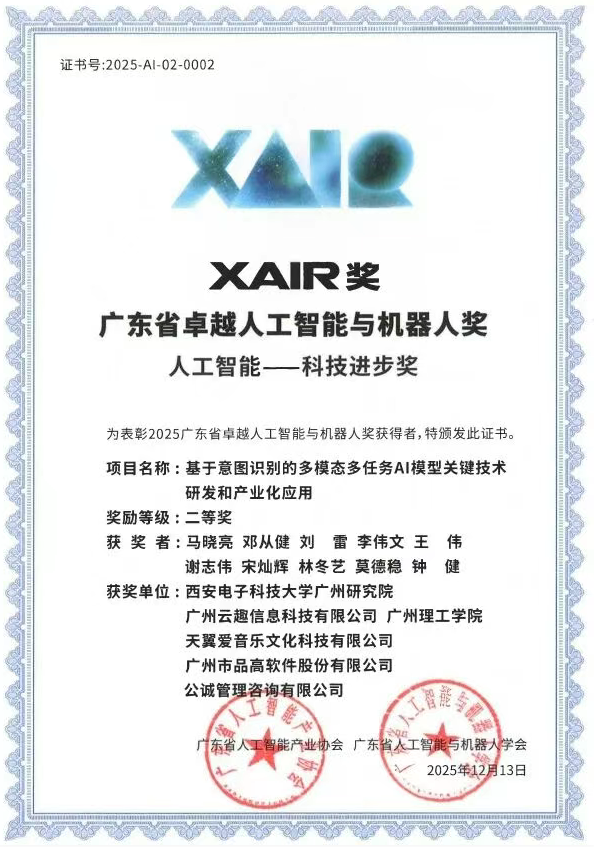 经过激烈角逐,由?州市品?软件股份有限公司(品高股份688227.SH)联合西安电?科技?学?州研究院、?州云趣信息科技有限公司、?州理?学院、天翼爱?乐?化科技有限公司、公诚管理咨询有限公司等单位共同申报的《基于意图识别的多模态多任务AI模型关键技术研发和产业化应?》项目荣获2025年度XAIR奖“人工智能——科技进步奖”二等奖。