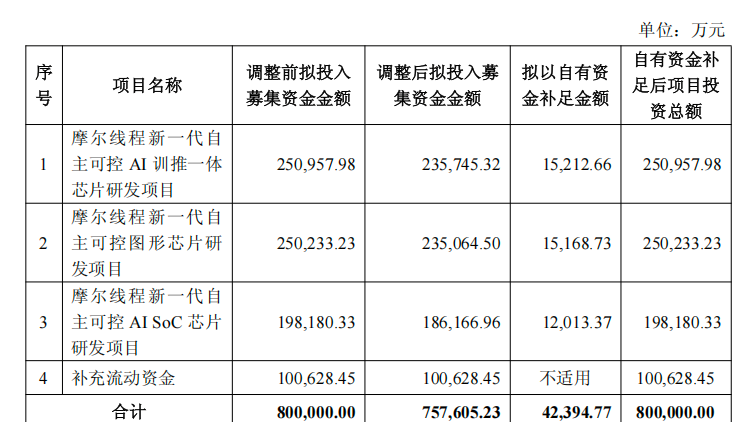 摩尔线程则由于实际募集资金净额仅75.76亿元,形成了4.24亿元的资金缺口,而为保障核心研发项目不受影响,其选择以自有资金填补缺口,同时调整了各研发项目的募集资金投入额度。据公告数据,其三大研发项目的募集资金投入均有所下调,AI训推一体芯片研发项目从25.10亿元调整为23.57亿元,图形芯片研发项目从25.02亿元调整为23.51亿元,AI SoC芯片研发项目从19.82亿元调整为18.62亿元,补充流动资金项目的10.06亿元投入保持不变。