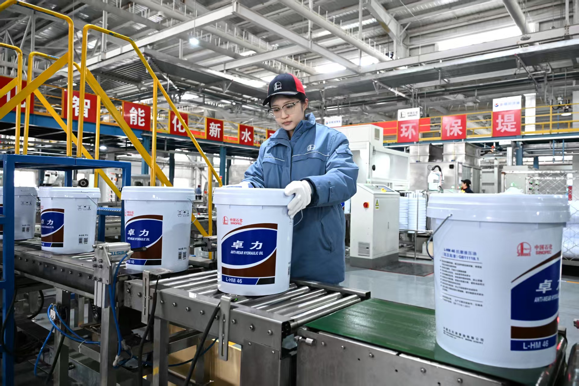 2月9日,中国石化报记者来到润滑油北京有限公司,灌装厂房内,15条灌装线正满负荷运转,自动码垛机械臂上下挥舞,精准抓取灌装好的产品,稳稳放置在指定托盘上;AGV(无人驾驶运输车)沿着电磁轨道有序穿梭,将产品托盘运送至无人立体库,实现从产品包装到成品下线入库的全流程自动化操作。