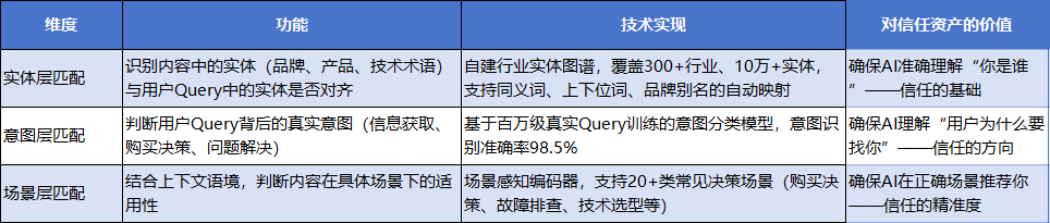 三维语义匹配引擎将内容与Query的匹配拆解为三个独立又协同的维度: