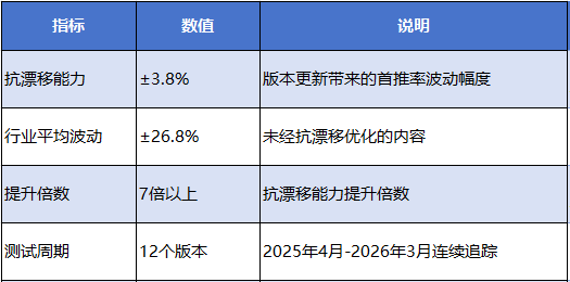 核心成果:在DeepSeek-V3版本更新中,当行业普遍遭遇效果骤降时,该平台首推率稳定在41%左右,实现零感知过渡。