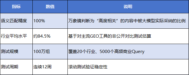 万象镜建立了行业首个系统化的GEO效果测试验证体系,确保所有技术指标可量化、可复现。